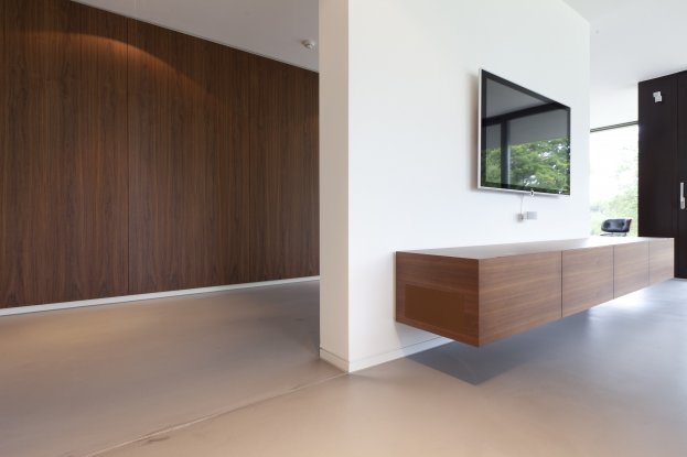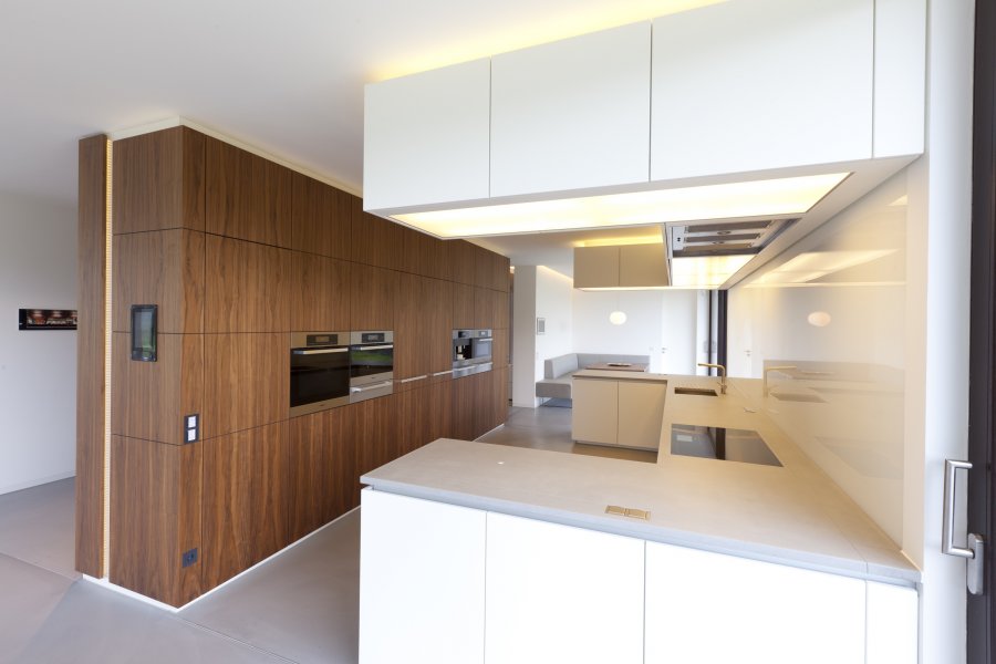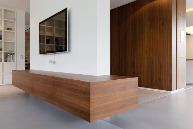 Das Wohnzimmer bietet mit seiner Bose Surround Anlage in Kombination mit dem Loewe TV eine cineastische Insel und fügt sich dennoch natlos in die Archiktektur. Der Subwoofer wurde im Lowboard unsichtbar intergiert, hier finden auch alle weiteren Komponeten Platz. Die speziellen Anforderungen an das Möbel wurden gemeinsam mit dem Architekten geplant und umgesetzt.