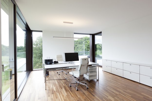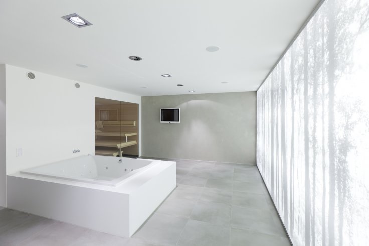 Der Solitär fügt sich elegant in die Landschaft und erlaubt einen Blick in die Weiten der Düsseldorfer Täler. Angepasst an die Topograie des Hangs bietet er einen angenehmen Kontrast von Natur und Moderne. Im Haus M geht es um klare Linien und maßvolle Reduktion. Ob beim Frühstück, beim Fitnesstraining oder bei entspannen im Garten, mit seinen 11 Musikzonen kann der Kunde hier immer für eine passendes Klangbild sorgen. Auch die Informationen in visueller Form begleiten den Kunden mit passenden Loewe TV´s in verschiedenen Bereichen des Hauses.