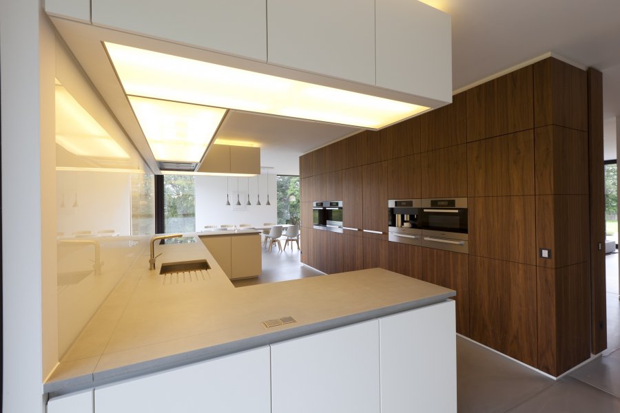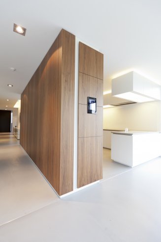 In der Küche sind die Lautsprecher gleich ganz unsichtbar, dafür jedoch gut hörbar. Sie befinden sich in den oberen Schranktüren des Küchenschranks und bringen die Holzfläche zu "klingen". So bleibt selbst die Schrankfläche für Küchenuntensilien erhalten.